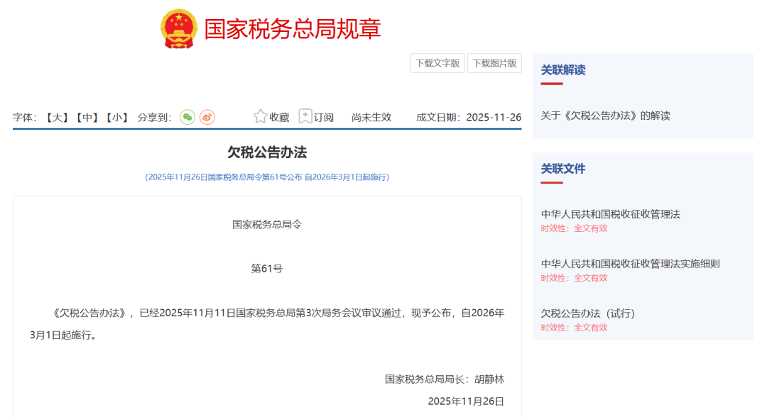 重大变革!国家税务总局正式发布2025年第61号令《欠税公告办法》,将于2026年3月1日起实施。这标志着我国欠税管理模式迎来20年来最彻底的颠覆性变革!